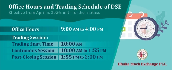 As per the decision of the Government of Bangladesh, the Management of DSE has decided the following office hours and trading schedule of Dhaka Stock Exchange PLC, effective from April 5, 2026, until further notice: Office Hours: From 9:00 am to 4:00 pm Trading Session: Continuous Session: From 10:00 am to 1:55 pm Post-Closing Session: From 1:55 pm to 2:00 pm